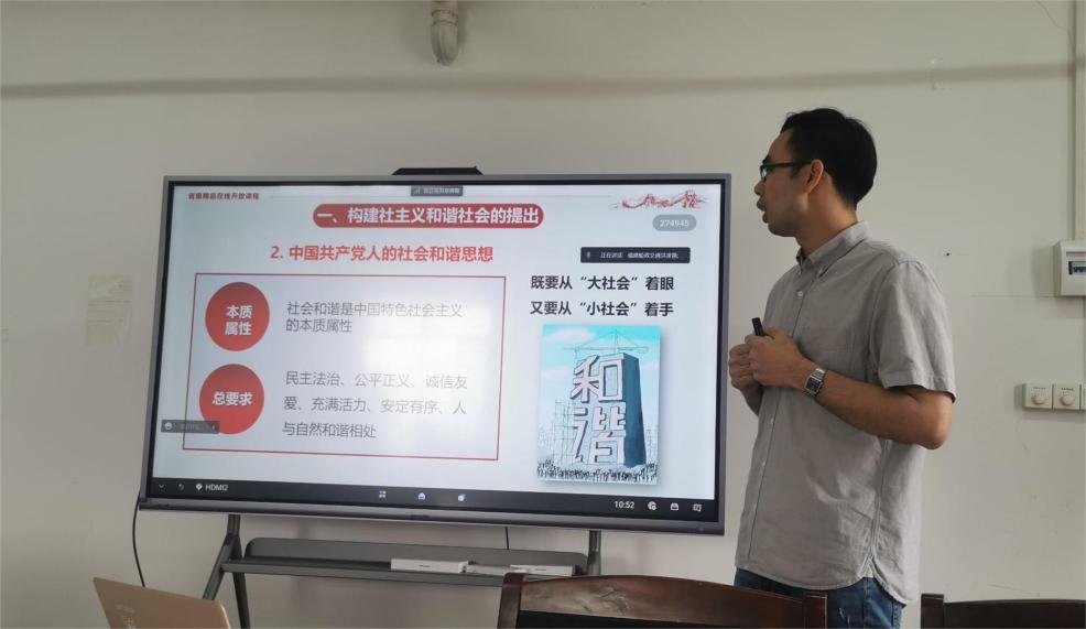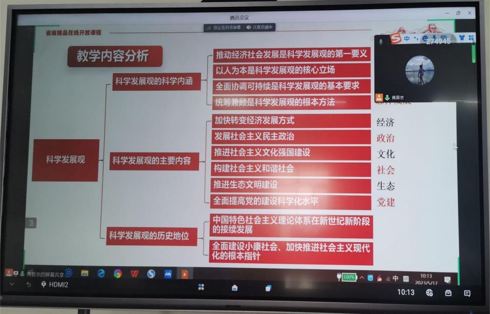 2023年5月17日,马克思主义学院“毛泽东思想和中国特色社会主义理论体系概论”教研室全体专兼职教师在图书馆11楼1101室开展了“优·美”教学工作坊教研活动。本次教研活动围绕概论第八章“科学发展观”展开教学研讨活动,由黄晋京老师担任主备课人。