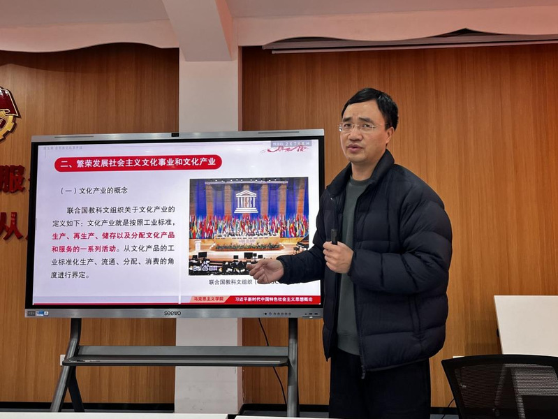 为更好地开展“习近平新时代中国特色社会主义思想概论”课程教学,2024年4月7日,马克思主义学院习近平新时代中国特色社会主义思想概论教研室开展了本学期第十一次思政课教师“大练兵”暨“优·美”教学工作坊集体备课活动。围绕本课程的第十章“建设社会主义文化强国 ”展开教学研究。本次集体备课由严兵老师担任主讲,张玉祥与张瑞青老师分别做片段教学展示。