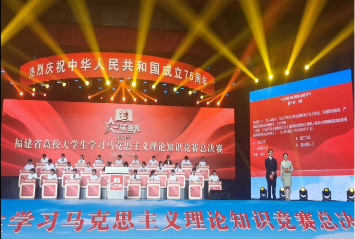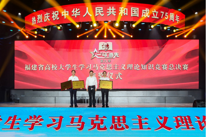 为热烈庆祝中华人民共和国成立75周年,坚持不懈用习近平新时代中国特色社会主义思想铸魂育人,引导青年学生立报国强国大志向、做挺膺担当奋斗者,9月27日,由中共福建省委教育工委主办,福建省高校思想政治理论课教学指导委员会、福建教育电视台承办的第九季福建省高校大学生学习马克思主义理论“一‘马’当先”知识竞赛总决赛在福州大学旗山校区落下帷幕。我院党委书记陈宜大携师生代表参与活动观摩。