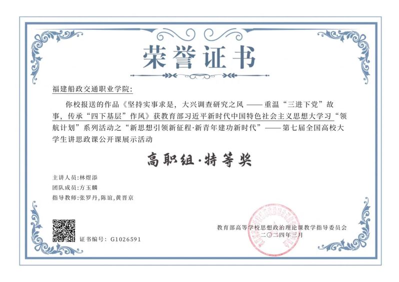日前,根据教育部高校思政课教学指导委员会和福建省委教育工委的评审结果,我院选送的作品《坚持实事求是,大兴调查研究之风——重温“三进下党”故事,传承“四下基层”作风》荣获第七届全国高校大学生讲思政课公开课展示活动高职组特等奖,《从百年船厂蝶变看创新伟力》荣获第七届全省高校大学生讲思政课公开课展示活动高职组二等奖。