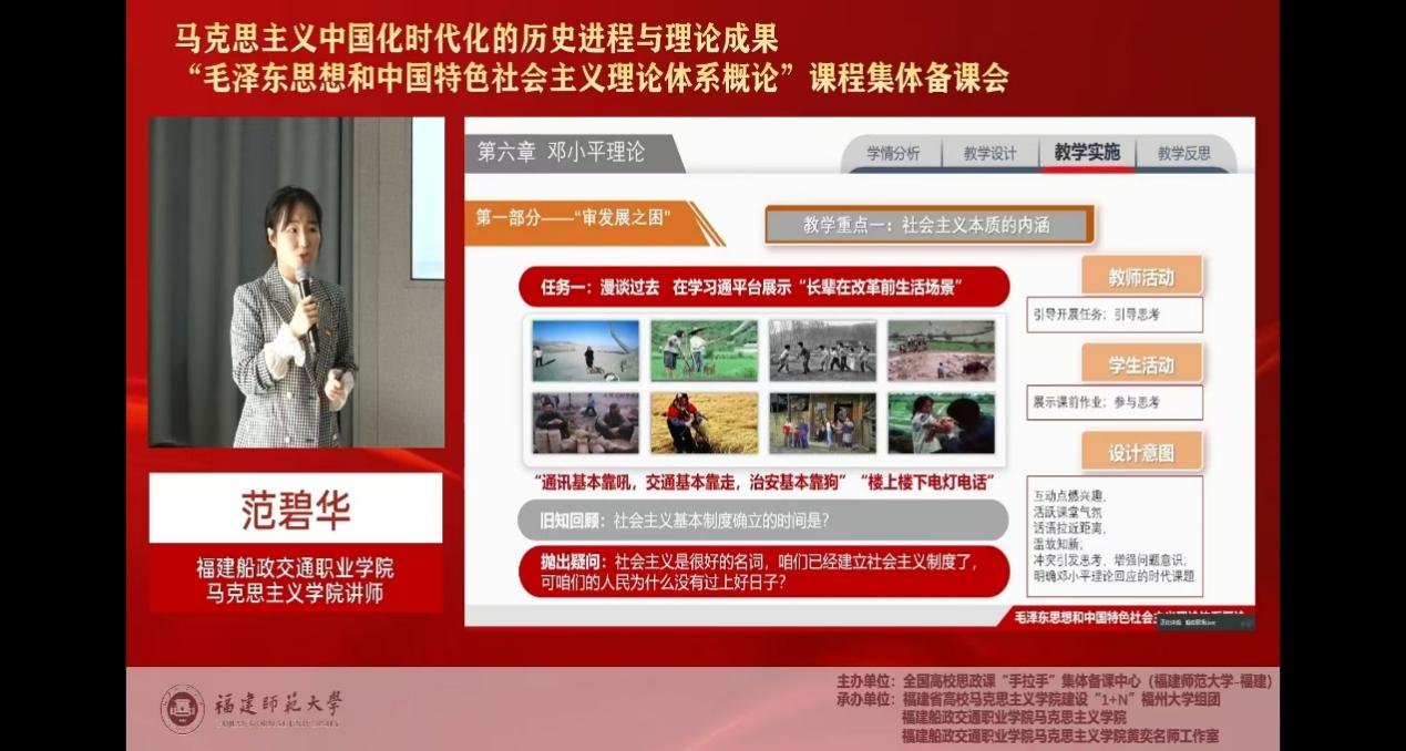 本次集备会由全国高校思政课“手拉手”集体备课中心(福建师范大学—福建省)主办,福建省高校马克思主义学院建设“1+N”福州大学组团、福建船政交通职业学院马克思主义学院、福建船政交通职业学院马克思主义学院黄奕名师工作室承办。概论教研室教师范碧华在本次集体备课会中进行说课展示,其他教师在线下共同观摩学习。