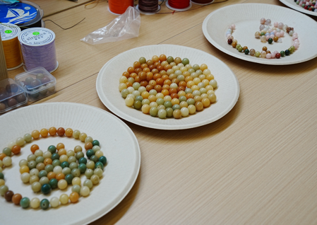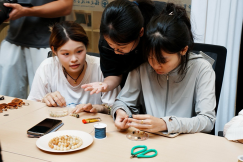 在老师的悉心指导下,同学们纷纷拿起手中的编绳和彩珠,跃跃欲试,期待那一根根编绳能在自己手上编出精美的作品。