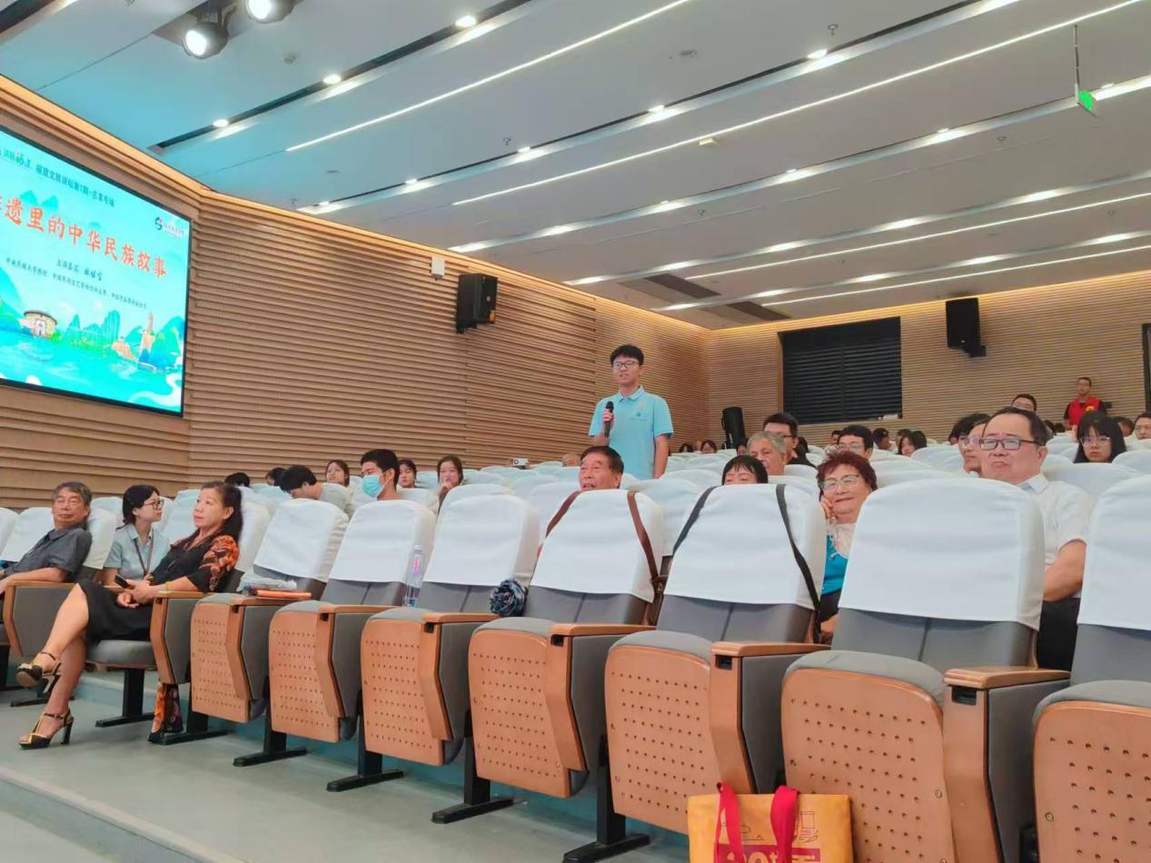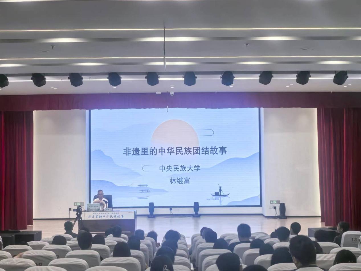 同学们在志愿服务的同时,还观摩了名家专场《非遗里的中华民族故事》的讲座,主讲人中央民族大学教授、中国民俗学会副会长、中国民间文艺家协会副主席林继富通过专业的学术知识和丰富的实例展示,从“洪水神话”“英雄史诗”“历史传说”三个维度,为大家揭示非遗在促进民族团结和铸牢中华民族共同体意识中的重要作用。