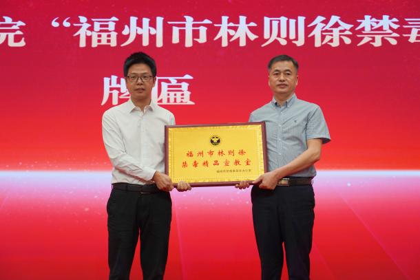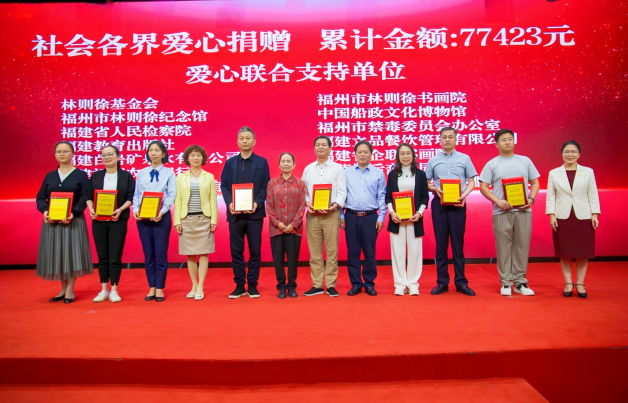 随后,林则徐基金会副会长、沈葆桢第六代后裔沈园代表林则徐基金会将水墨长卷国画作品惠赠学院;福州市公安局禁毒支队二级高级警长陈孔寿代表福州市禁毒办向学院授发“福州市林则徐禁毒精品宣教室”牌匾;全国人大原常委、福建省人大常委会原副主任、林则徐基金会荣誉会长、林则徐第六代后裔林强代表林则徐基金会授予学院“爱心图书室”牌匾。活动还为爱心联合支持单位进行表彰。