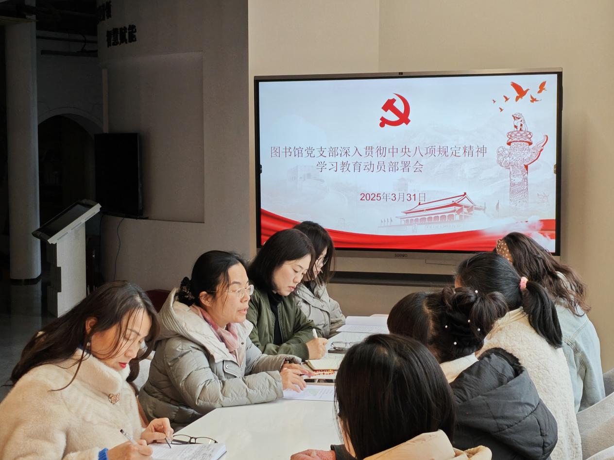 2025年3月31日,图书馆党支部召开专题会议,会议传达了学院关于深入贯彻中央八项规定精神学习教育动员会议的工作部署要求,全面动员和部署支部学习教育工作。会议由党支部陈林书记主持,全体党员参加。陈林书记指出,开展此次习教育是落实习近平总书记重要指示精神、巩固深化主题教育成果、推进全面从严治党向基层延伸的重要举措。支部全体党员干部要提高政治站位,深刻认识作风建设对学院高质量发展、师德师风建设及服务师生的重要意义,切实将思想和行动统一到党中央决策部署上来。会议强调,要结合图书馆工作实际,学深悟透,通过集中学习、个人自学等形式,深入领会中央八项规定精神的核心要义,将作风建设贯穿文献资源服务、读者服务、内部管理全过程;查改结合,对照党章党规和岗位职责,全面查摆服务意识、工作效能、纪律执行等方面存在的问题,建立整改台账并限期落实;长效常治,将学习教育与巡视整改相结合,完善制度规范,推动作风建设常态化、制度化。