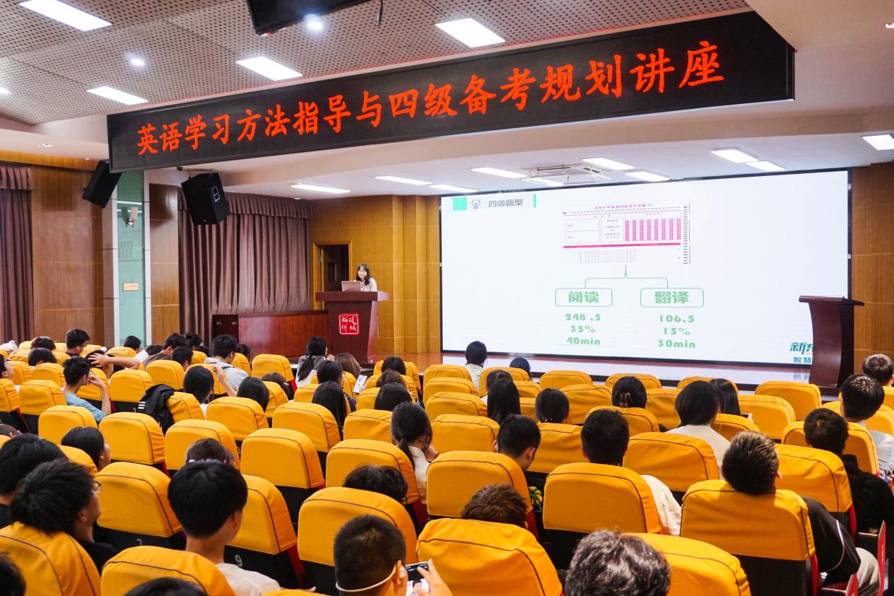 讲座特邀新东方金牌讲师俞炀炀主讲,从“四级考情速递”“学习误区盘点”“高分策略拆解”“资源工具推荐”四个维度展开系统讲解,讲座深入浅出,现场气氛热烈。同学们纷纷表示,讲座内容“干货满满”,不仅明确了备考方向,更掌握了诸多高效的学习方法。