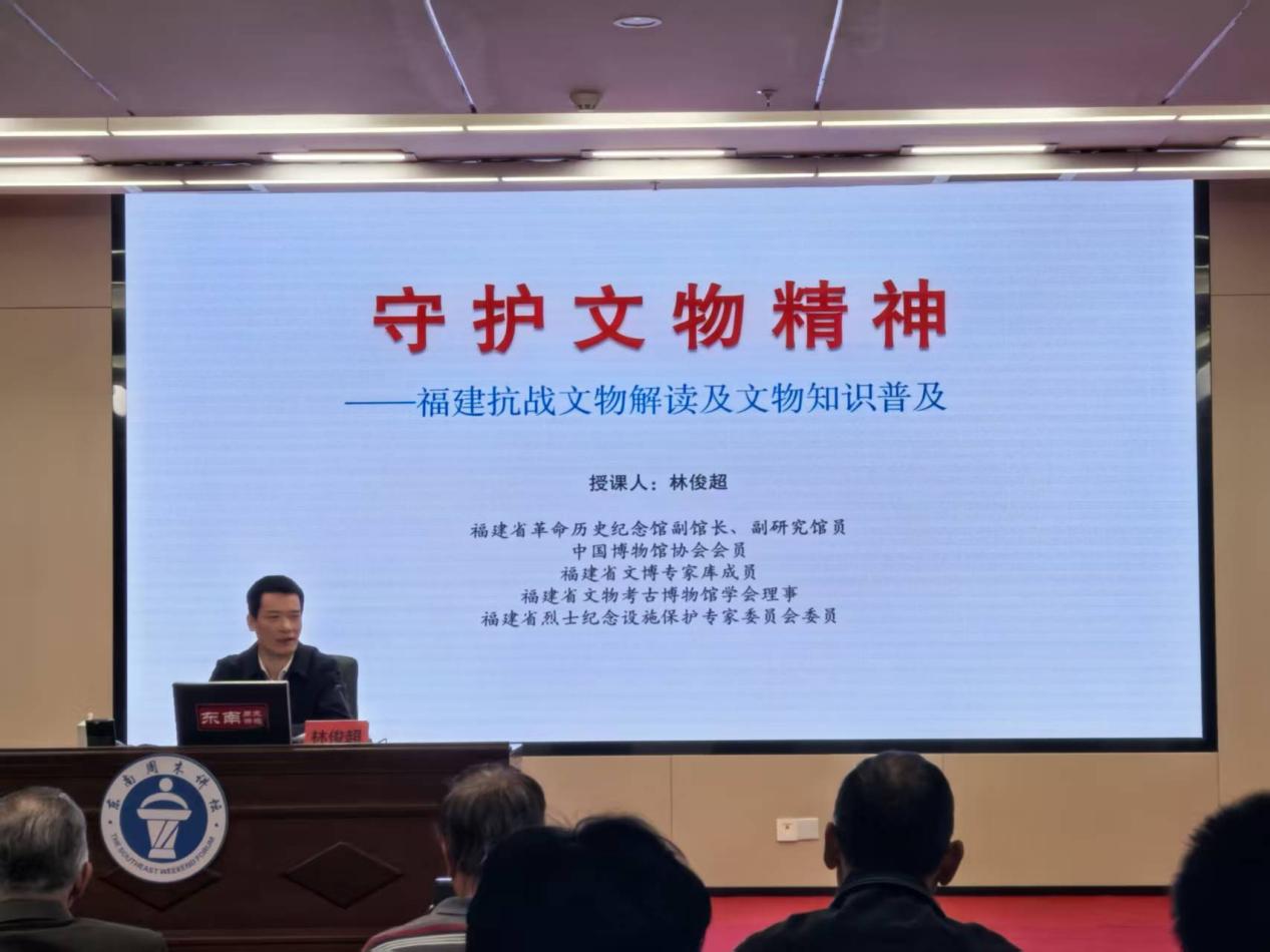 随后齐聚讲座会场,聆听了由福建省革命历史纪念馆林俊超副馆长主讲的《守护文物‘精神’——福建抗战文物解读及文物知识普及》专题讲座。林馆长以丰富的文物实例,包括杨成武将军使用过的望远镜等珍贵抗战文物,深入浅出地解读了福建抗战历史,讲述了文物背后蕴含的抗战精神和民族气节。通过专业生动的讲解,志愿者们对福建抗战历史有了更深刻的认识,进一步树立了保护抗战文物的意识。
