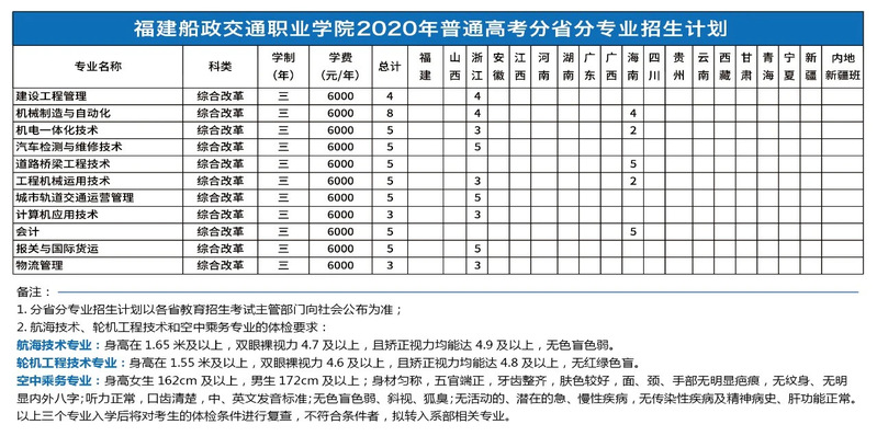 福建船政交通职业学院2020年普通高考分省分专业招生计划