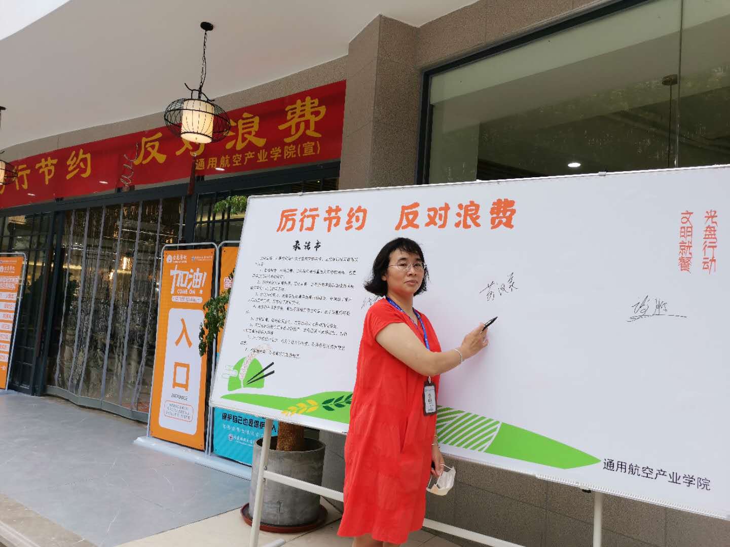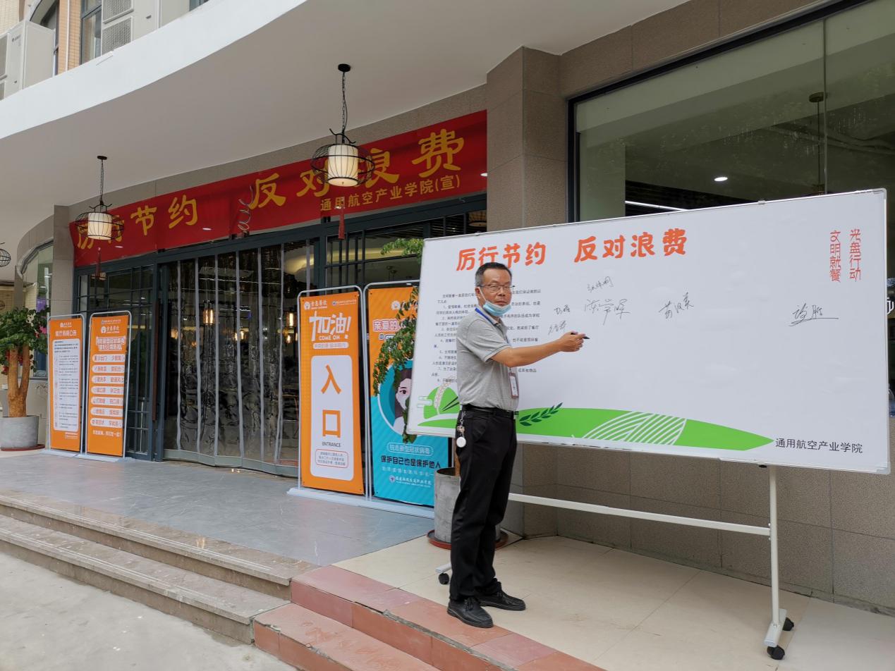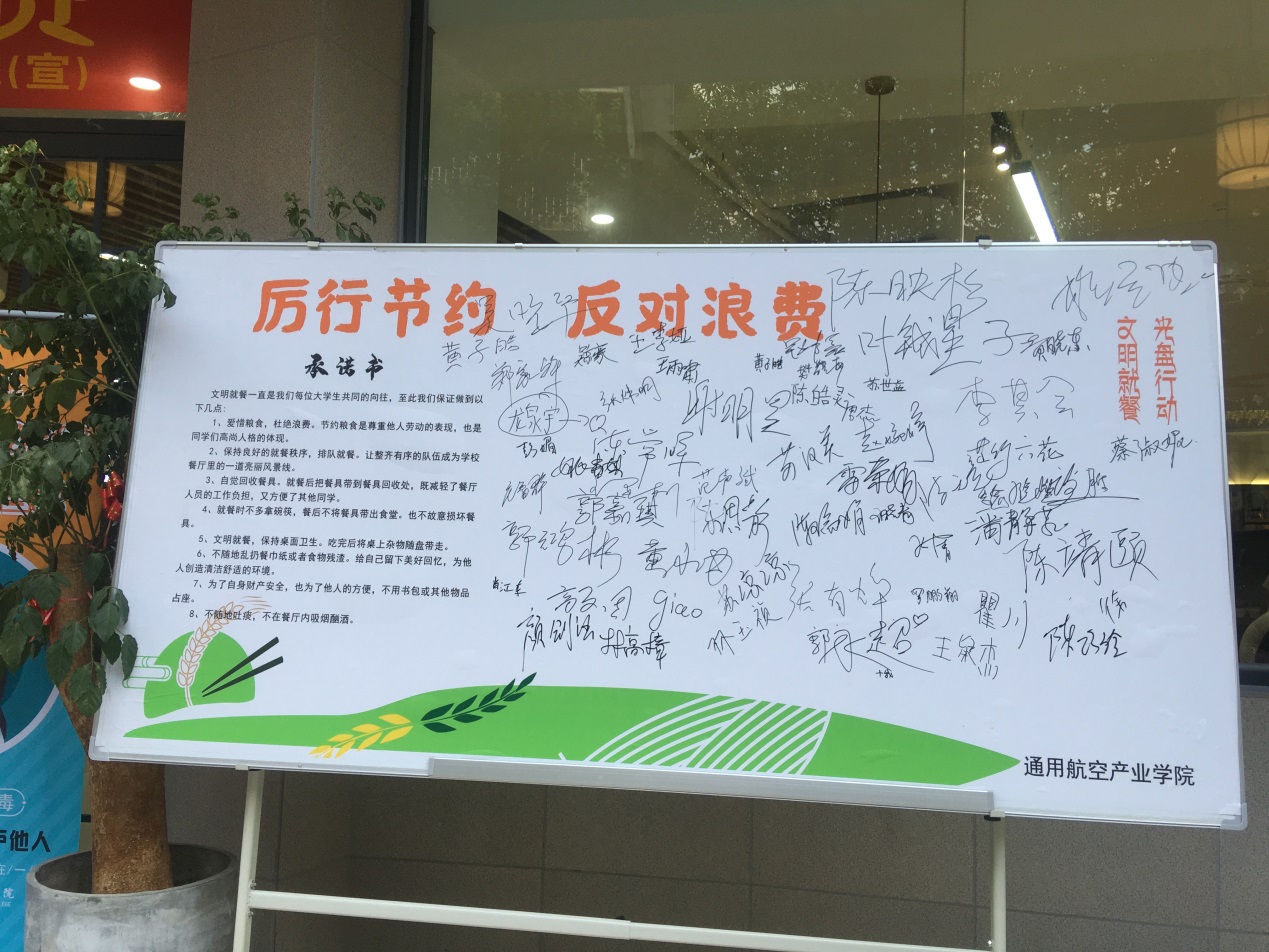 勤俭节约是中华民族的优良品德,为了将文明健康、绿色环保的理念融入日常生活。通用航空产业学院在2018级、2019级学生返校之际,开展以“厉行节约,反对浪费”为主题的系列活动,通用航空产业学院院长陈常晖、党总支副书记苏汉美、副院长王显彬等领导,及学院师生,食堂员工等也纷纷在“厉行节约,反对浪费”签名墙上签署名字,带头承诺,发挥带头表率作用。随后,院领导深入学生食堂与学生一同用餐,用光盘行动,诠释浪费可耻、节约为荣。