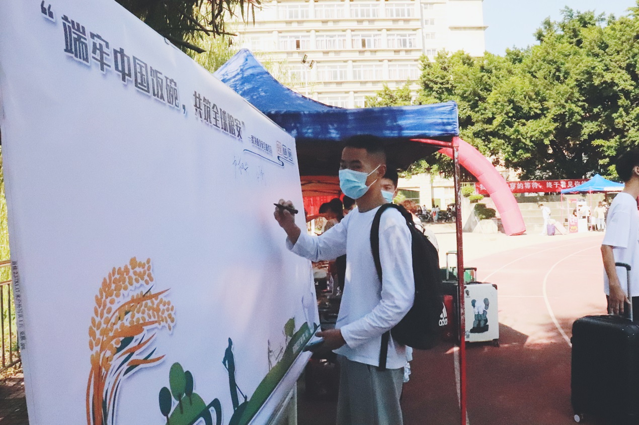 新生在“端牢中国饭碗,共筑全球粮安”签名墙上签名