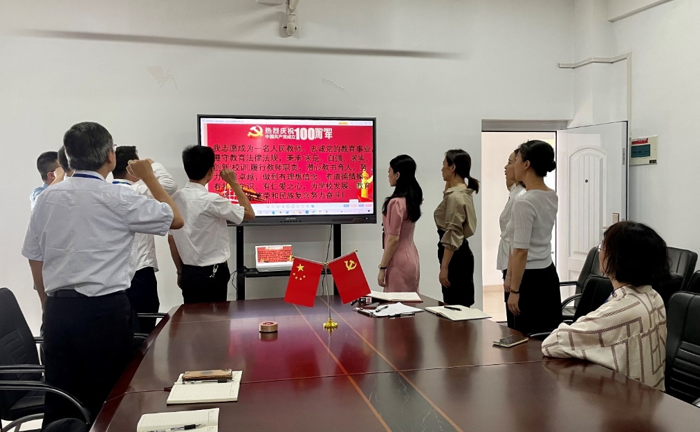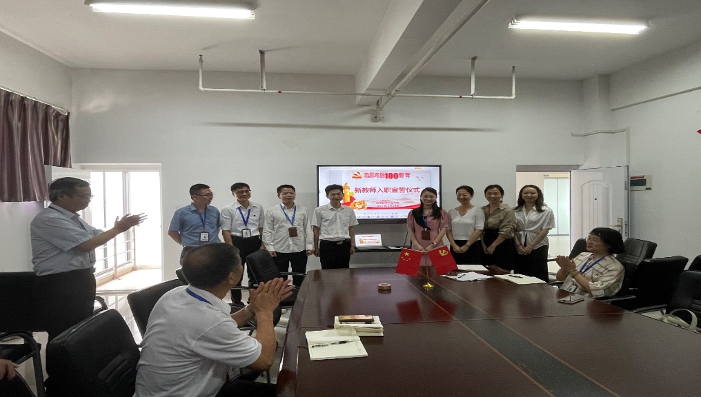 为进一步增强新教师的荣誉感、责任感和使命感,7月1日, 我院在会议室举行2021年新教师入职宣誓仪式。学院党总支副书记苏汉美同志代表教职工向全体新教师表示热烈欢迎,随后,学院院长陈常晖教授领誓,全体新入职教师面对誓词,举起右手,庄严宣誓,我志愿成为一名人民教师,忠诚党的教育事业,遵守教育法律法规,秉承‘求是、自强、求实、创新’校训,履行教师职责,潜心教书育人,努力追求卓越,做到有理想信念、有道德情操、有扎实学识、有仁爱之心,为学校发展、教育振兴、国家繁荣和民族复兴努力奋斗!掷地有声的誓词,紧握高举的右拳,是每一位新教师的自我期许,更是对教育事业的庄严承诺。