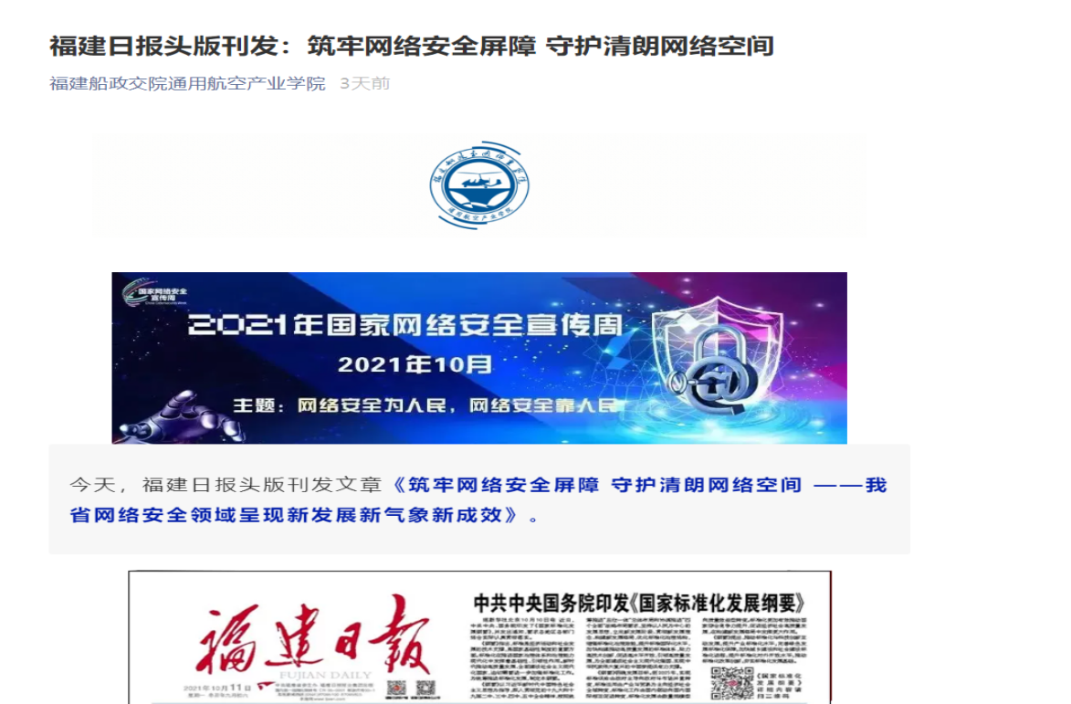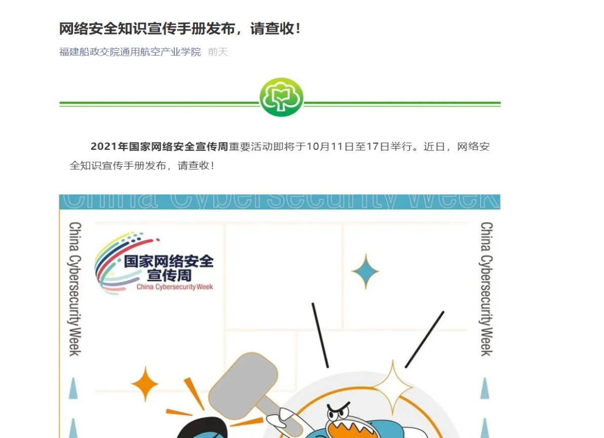 在2021年国家网络安全宣传周期间,通航空产业学院开展了一系列线上线下活动,引导师生养成依法上网、文明上网、安全上网的良好习惯。二是转载官方网站宣传网络安全小视频,提醒师生保护个人信息,谨防被骗;三是全方位动员师生自觉成为维护国家网络安全的重要力量,争做网络安全的践行者、参与者、推动者、宣传者,为共享共建清朗、便捷的网络空间,共同维护国家网络安全营造良好的氛围。