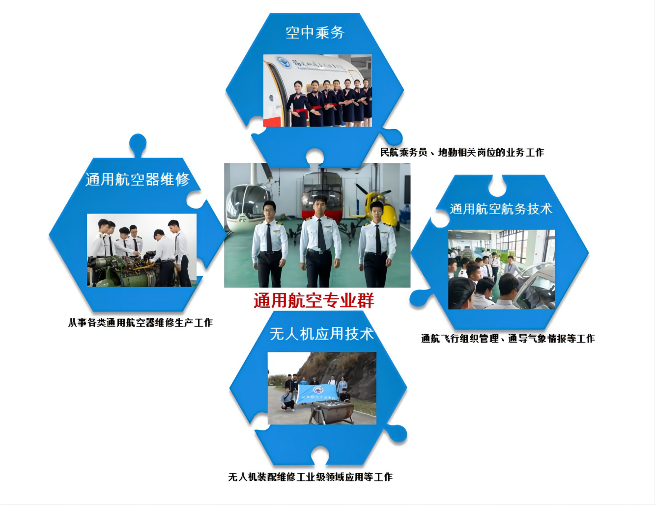 定位于培养,低空飞行器维修、维护和保养,学习航空器紧固件、标准线路、管路、操纵、航电和防腐等基础维修技能,学习主流直升机型,如罗滨逊R44、贝尔等检修与保养。熟悉飞机航线维护的航前、航后、短停时的检查、维护与勤务等工作方法及流程。具备良好职业素质、行业规范与创新精神,具备一定的组织管理能力,从事通用航空器维修生产工作的高素质技术技能人才。