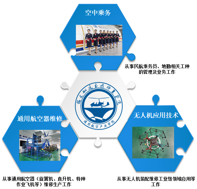 通用航空产业学院开设有“通用航空器维修”、“通用航空航务技术”、“空中乘务”和“无人机应用技术”等专业,按照国家民航总局标准规范开设课程,配置实训设施,设置省级科技创新平台“通用航空应用技术研发中心”,与匈牙利摩根斯达集团和德布勒森大学互派技术人员,开展通航技术研发。同时学校同福建和翔福宁通航公司、弗莱通用航空服务公司和福建通航行业协会等多家企业、组织建立了紧密的校企合作关系,学校也当选为“福建省通用航空行业协会”副理事长单位。