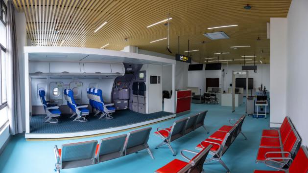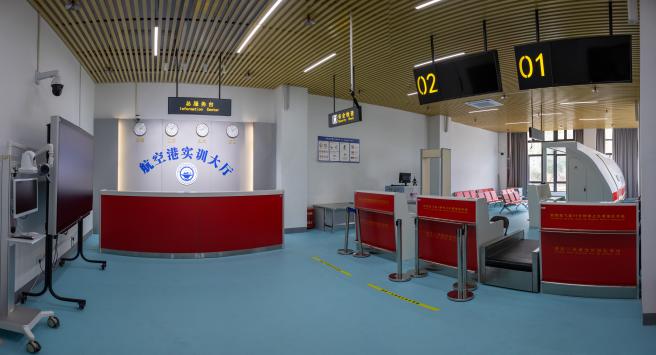“空中乘务”实训中心,按照民航总局四级乘务员教学培训标准,建设有模拟客舱、撤离平台、机场地面服务、形体训练室等。
