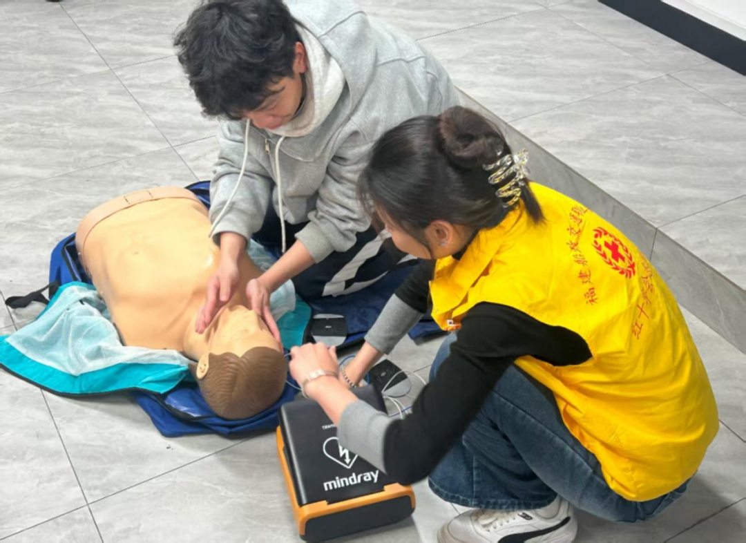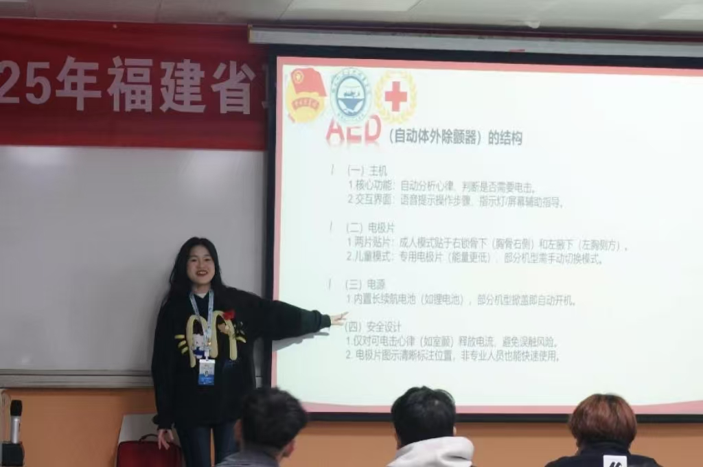 培训活动在福建船政交通职业学院南区举行,活动现场的红十字会志愿者在理论介绍环节从心脏骤停的危害和常见原因,到AED在急救中的关键作用,详细阐述了每一个重要知识点,接下来又通过生动的案例和直观的视频展示,讲解了体外除颤器(AED)的使用以及使用场景,让同学们深刻认识到掌握急救技能的重要性和紧迫性。
