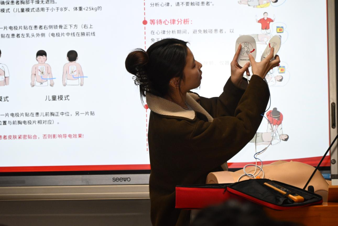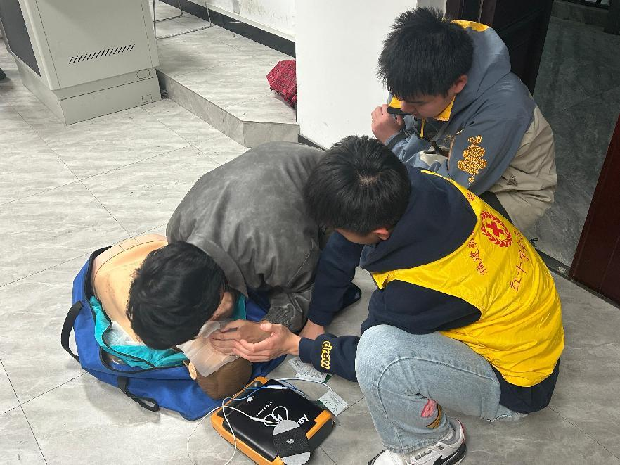 随后的实践操作环节,志愿者们先进行了场景模拟做了一次AED使用示范,随后同学们在志愿者的指导下,利用模拟人、AED训练机等设备,亲身体验心肺复苏、止血包扎等急救操作。志愿者们一对一地纠正同学们的操作手法,确保每位同学都能准确掌握急救技能的要领。大家积极参与,学习热情高涨,纷纷表示此次培训收获颇丰。