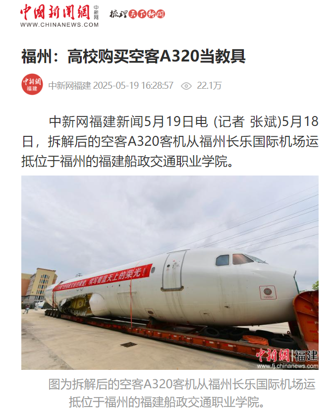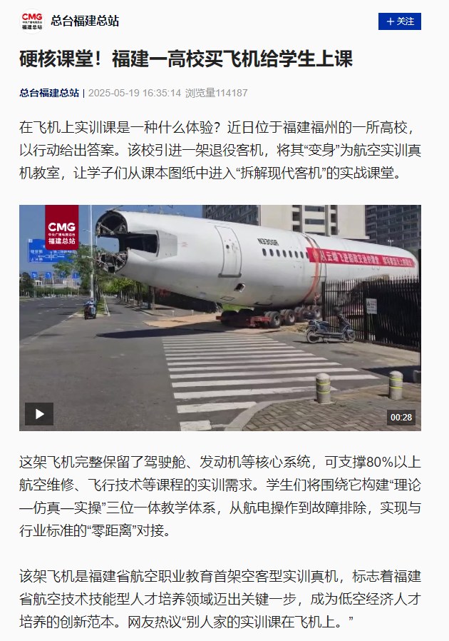 该架飞机是福建省航空职业教育首架空客型实训真机,标志着福建省航空技术技能型人才培养领域迈出关键一步,成为低空经济人才培养的创新范本。网友热议“别人家的实训课在飞机上。”