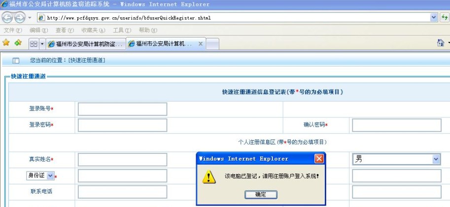 若当前电脑登记过了,将直接提示该电脑已登记过,按"确定"接钮或右上角的X跳转至系统首页: