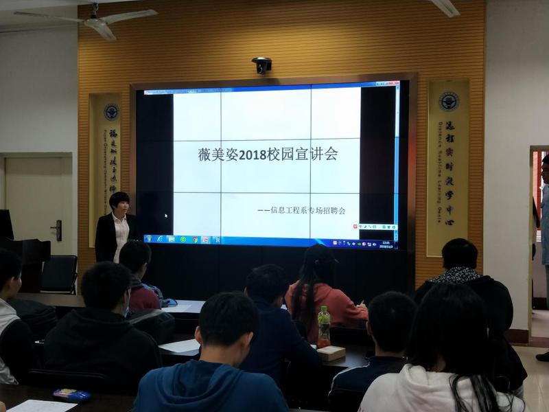 信息工程系于2018年11月2日中午12:30至下午3:00在北区2号楼2-1教室举办了信息工程系毕业生招聘宣讲会,薇美姿(舒克)实业有限公司宣讲人--林小姐为同学做了简单的介绍,薇美姿是集研发、生产和销售于一体的创新性高科技企业。旗下拥有两大口腔护理品牌舒客和舒客宝贝。产品遍布全国各省市,并已全线进入沃尔玛、家乐福、欧尚、易初莲花、吉之岛、大润发等国际、国内大型连锁卖场,实现了KA卖场、大型百货店、日化专卖店、药业连锁店及电子商务的全方位覆盖。