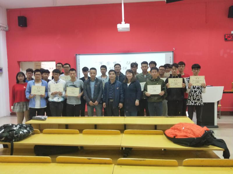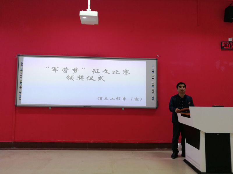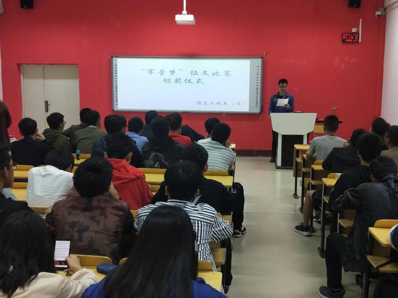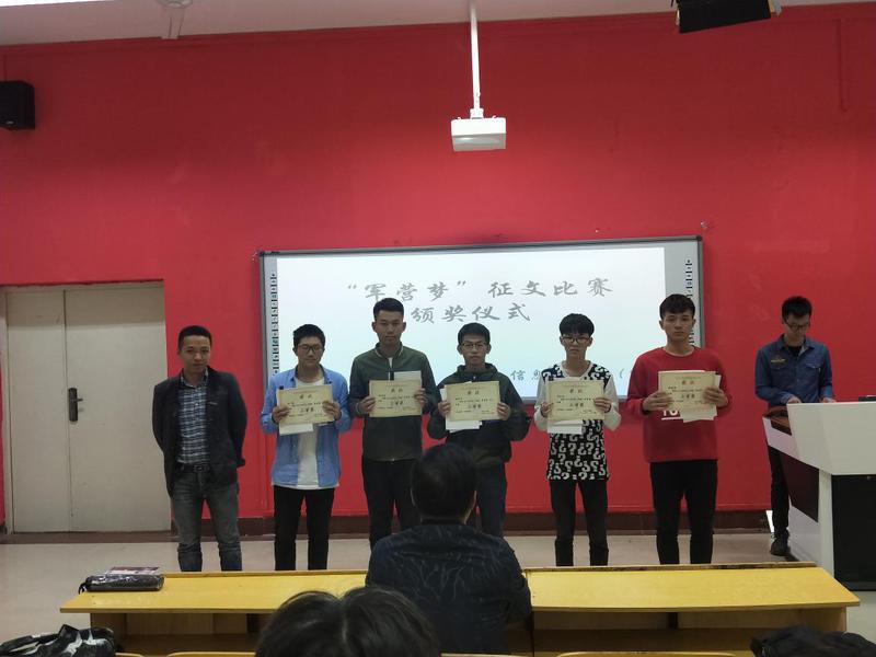为弘扬爱国主义精神,营造爱国热情的学院风范。2018年11月14日下午13:00在船政北区2#1-5举行了“军营梦”征文比赛颁奖仪式。信息系系书记孙基老师、征兵负责人唐晓军老师以及“军营梦”征文比赛负责人2017级辅导员黄华梅老师。本次颁奖仪式由2017级电信班唐宋杰主持。