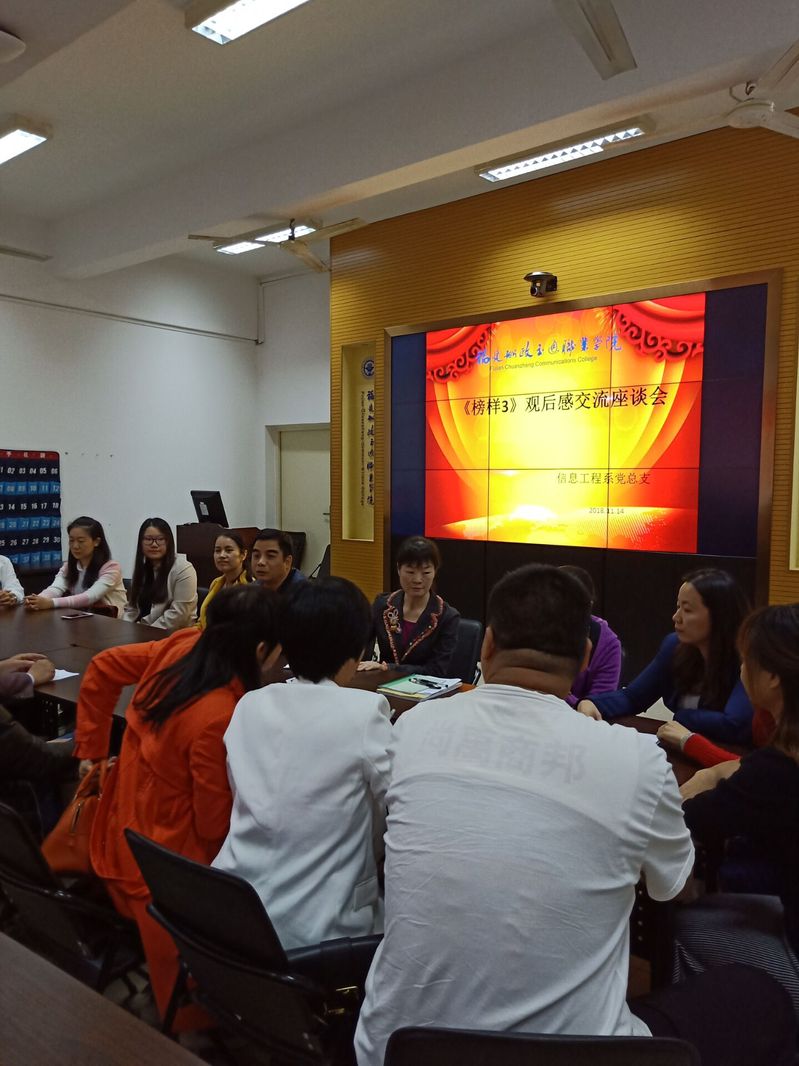 根据《中共中央组织部办公厅关于认真做好<榜样3>专题节目学习宣传工作的通知》(组厅字[2018]42号)文件精神,以及福建船政交通职业学院党委工作部的统一部署,信息工程系党总支把组织学习专题节目《榜样3》作为开展“两学一做”学习教育的一项重要内容,于2018年11月14日集中全系党员教职工在2-1远程教室集中观看《榜样3》,观影结束后,开展热烈的座谈交流,每位党员依次发表了相关体会,全体党员围绕“不忘初心、继续前行”,结合各自工作实际,从看榜样、学榜样,以感动变带动、化感动为行动的方面进行了深入交流探讨。