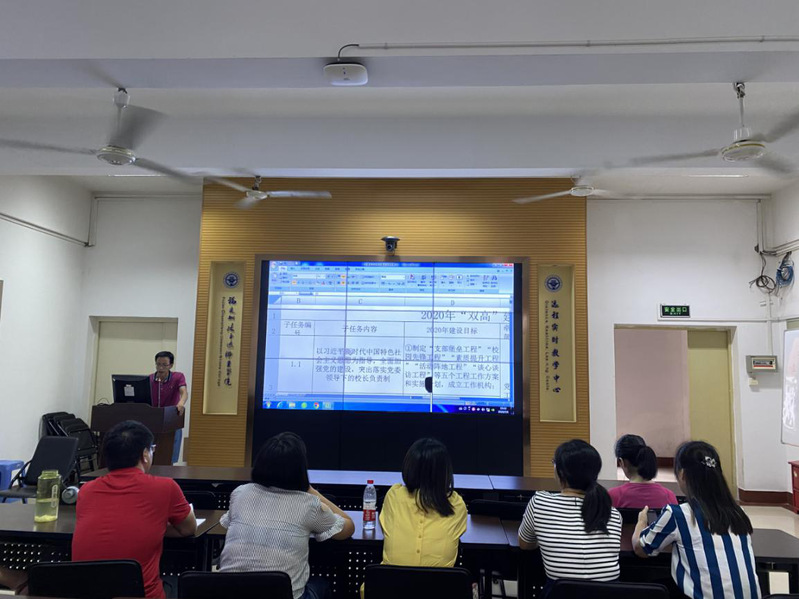 2020年6月10日下午,我系召开2020年双高建设推进会。会议由我系黄金凤主任主持,在推进会上,黄金凤主任表示,“双高”建设需要全系师生的智慧和力量,面对学院和系部发展的新形势新任务,我们要自信满怀、敢闯敢为,也要有忧患意识,改革创新,严格按照建设方案,对标对表,给自己多压压担子,设定具体建设周期和节点,一件接着一件办,以功成不必在我的境界和功成必定有我的担当,同心同德,群策群力,圆满完成 “双高”建设任务。