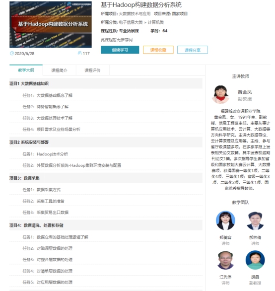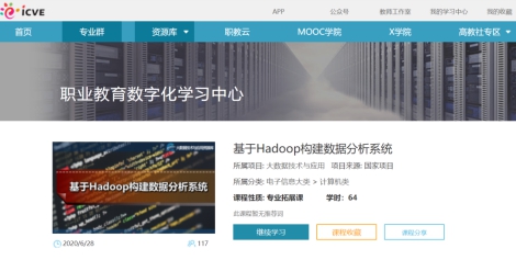 我院信息工程系参建“职业教育大数据技术与应用专业国家教学资源库” ,负责该专业的核心《基于Hadoop构建数据分析系统》(2018-06)的资源建设,项目依据于《大数据技术与应用专业教学资源库建设方案》和《大数据技术与应用专业教学资源库建设任务书》实现。