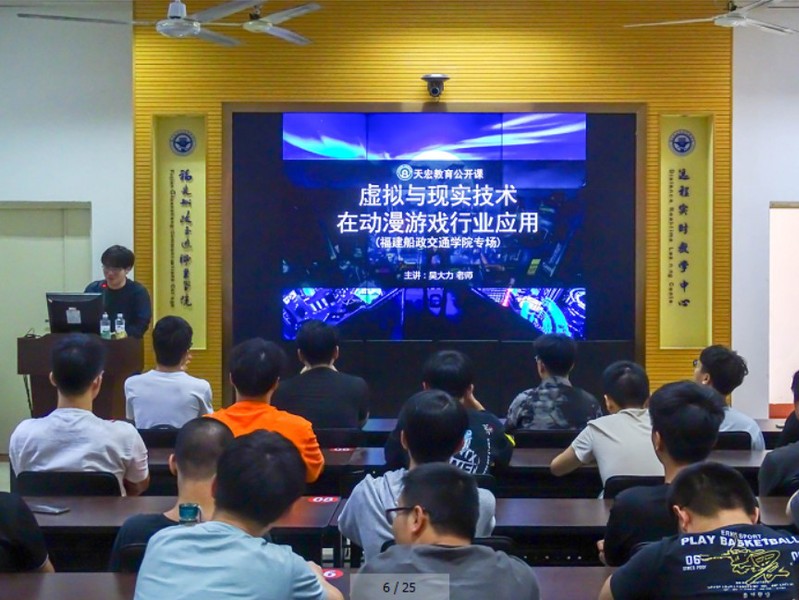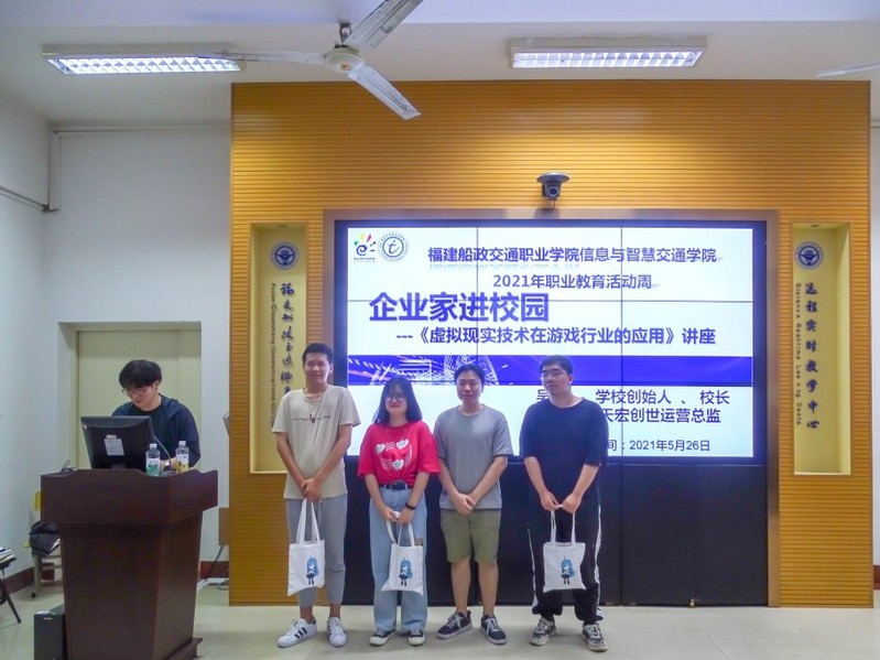 讲座由福州天宏创世文化传播股份有限公司运营总监吴捷分别从行业动态分析、行业数据分享、行业技术要求、技术案例分享等方面为我院学子做了以“虚拟现实应用技术在游戏行业的应用”为主题的分享。