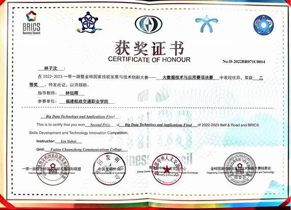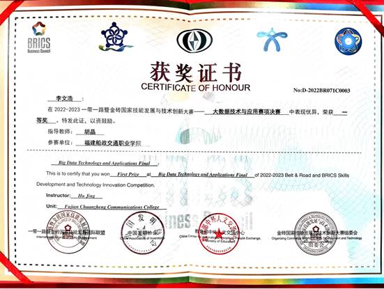 2022一带一路暨金砖国际技能发展与技术创新大赛——大数据技术与应用赛项于2023年3月6日在泸州职业技术圆满落幕,我校信息与智慧交通学院的李文浩、林子汶2位同学在胡晶和林钰晖2位老师的指导下分别斩获一等奖和二等奖的好成绩。