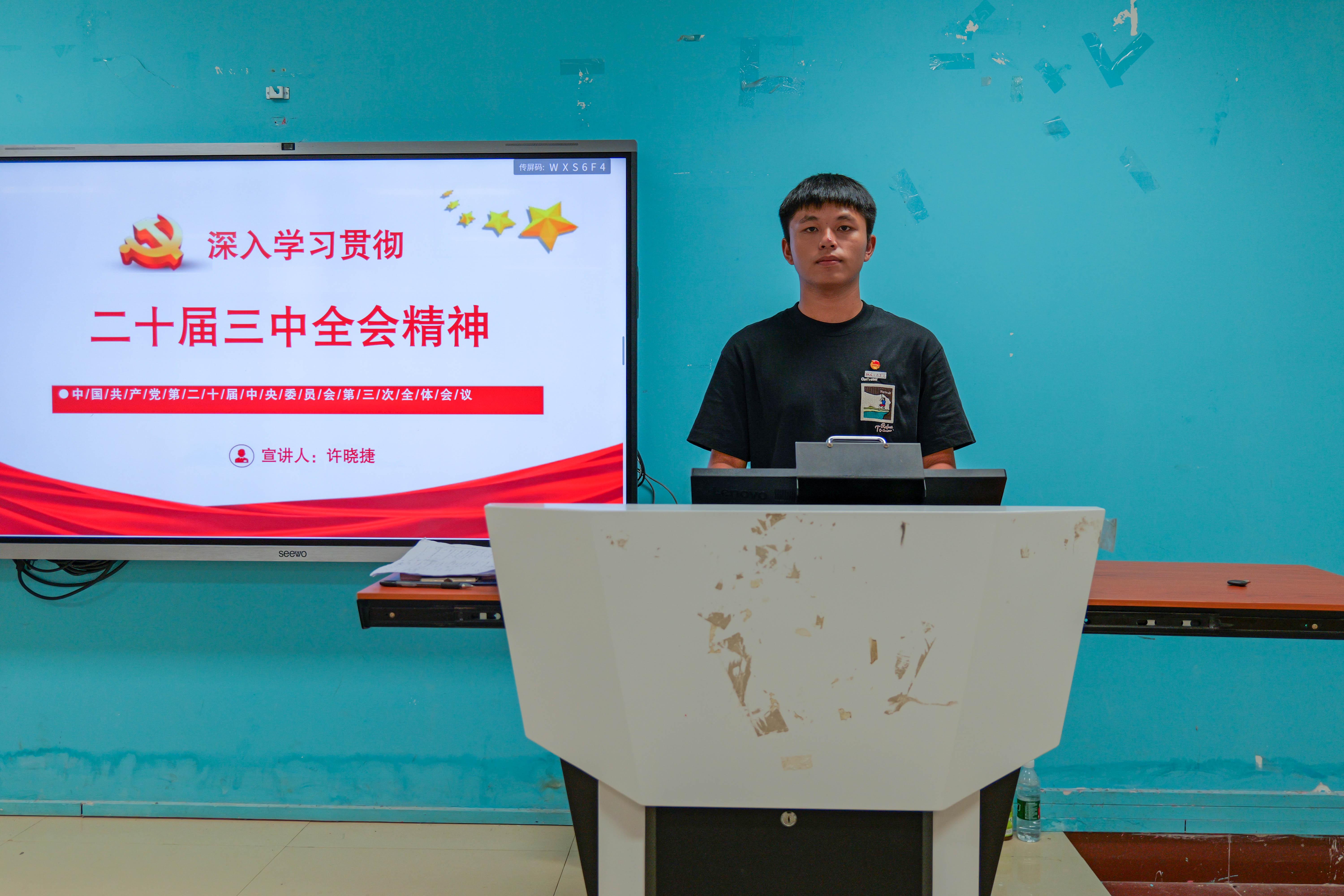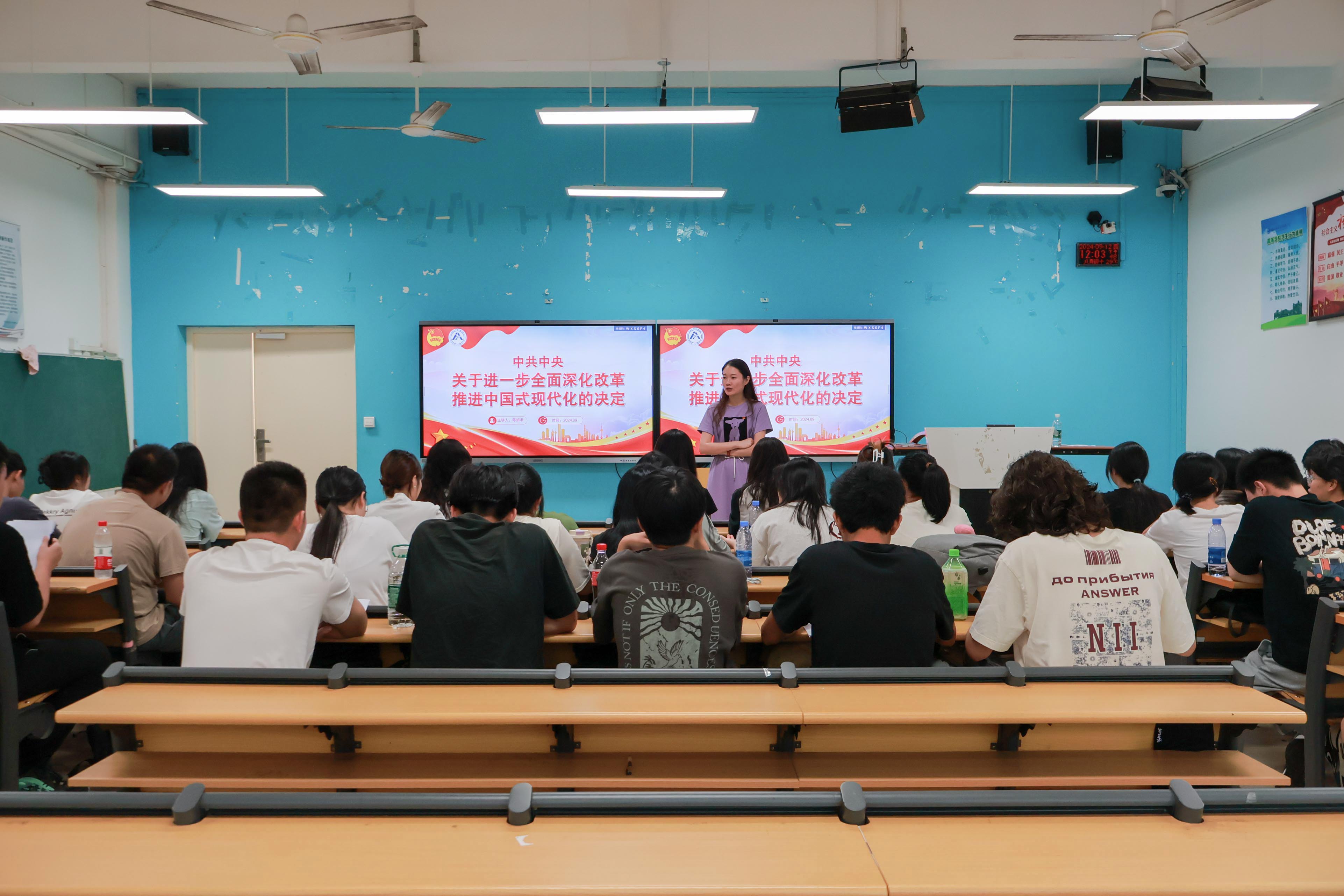 党的二十届三中全会是在以中国式现代化全面推进强国建设、民族复兴伟业的关键时期召开的一次十分重要的会议。为深入学习领会党的二十届三中全会的重大意义及习近平总书记在全会上的重要讲话精神,进一步激发青年学生的责任感和使命感,在校党委的工作指示下信息与智慧交通学院三名教师团干沈晨晞、周文广、陈妍君,四名大学生骨干许晓捷、陈杰、吴博涵、林宇宁于2024年9月组织开展以“深入学习贯彻党的二十届三中全会精神”为主题的宣讲活动。