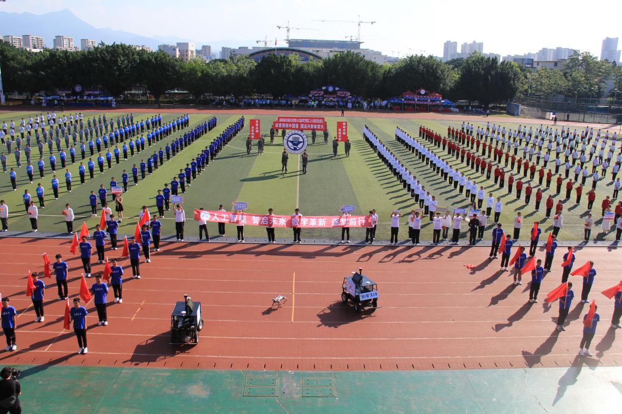 开幕式上,我院学子满怀着饱满的热情和昂扬的斗志,将青春的活力与团队的风采展现得淋漓尽致。挥旗表演整齐划一,那一面面鲜红旗帜恰似翻飞的火焰,为开幕式增添了一抹绚丽夺目的色彩。尤为引人瞩目的是,一只机器狗在跑道上灵活自如地穿梭,它时而轻快跳跃,时而敏捷翻滚,动作流畅自然,仿佛被赋予了鲜活的生命一般。同时,无人车也沿着跑道缓缓驶过,其车身设计简洁大方,线条流畅顺滑,处处彰显着未来感。这一表演不仅凸显出我院在机器人技术领域所取得的卓越成就,更让现场观众深切感受到了科技所蕴含的独特魅力以及无限可能。