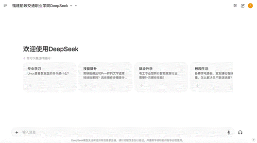 为更好地服务师生,支持利用人工智能技术辅助教学、实训和自主学习,DeepSeek-R1模型的本地化部署并试运行上线,面向在校师生提供DeepSeek通用问答平台服务。该平台不仅为教师提供了高效的教学辅助工具,还为学生提供了智能化的学习体验。