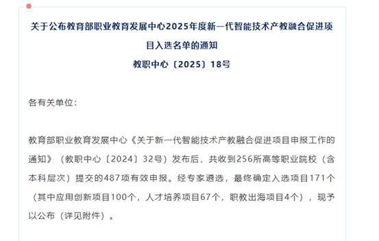 日前,教育部职业教育发展中心公布了2025年度新一代智能技术产教融合促进项目入选名单。我院项目“基于大语言模型工具调用的物联网语义控制应用开发”入选为应用创新项目。