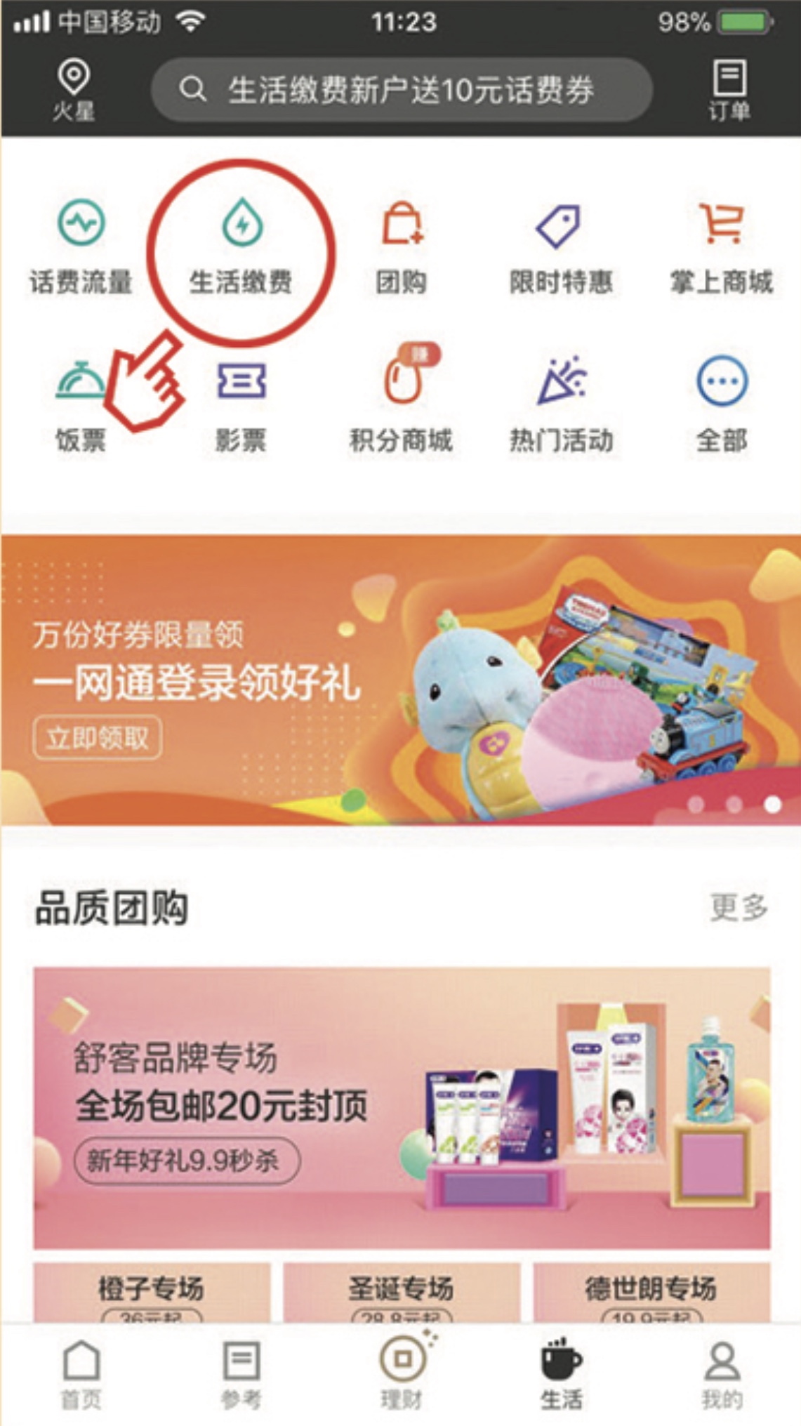 返回首页后点击下方“生活”频道中“生活缴费”按钮