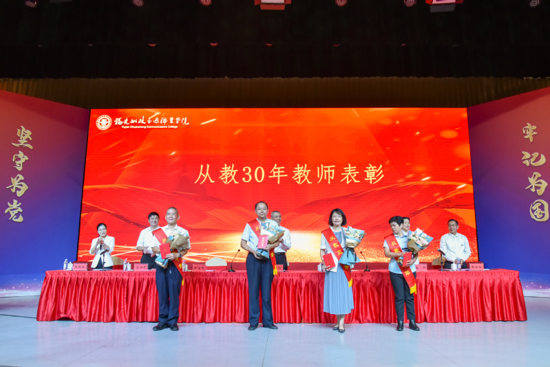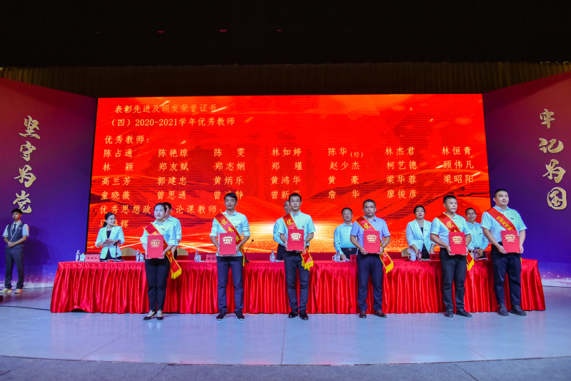 学院领导先后表彰2020-2021学年学院优秀人员获奖者、2021年福建省教师教学能力比赛、2020年福建省职业教育省级教学成果奖、2021年全国职业院校技能大赛获奖指导教师、近一年省级以上先进个人及先进集体等,并为受表彰的个人和集体代表颁奖。