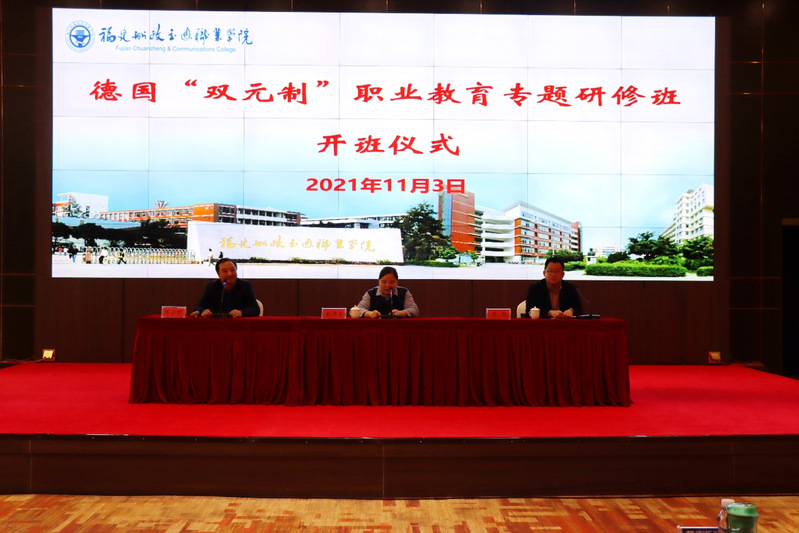 中德职业教育联盟福建省示范基地德国“双元制”职业教育专题研修班在我院武夷新区职教园顺利开班,福建省教育国际交流协会副秘书长张沛玉出席开班仪式,福建船政交通职业学院对外交流中心主持仪式。来自福建省本科、高职及中职29所学校共100名骨干教师、专业带头人及教学管理人员参加此次研修班学习。